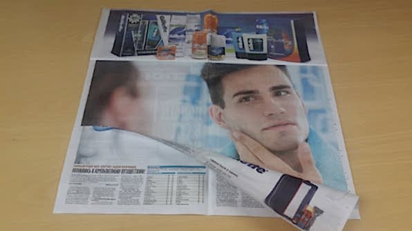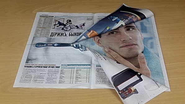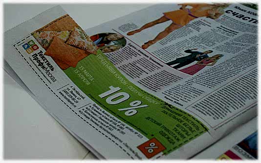 Образцы:Опция «УМНЫЙ КЛЕЙ»«Умный клей» Уникальное и эксклюзивное размещение рекламы на страницах газет. Свежее решение, разработанное специалистами нашей типографии позволяет раздвинуть привычные рамки предлагаемых типографиями услуг, «Пин-ап» варианты размещения рекламной информации без изменения редакционного контента. Приклеивание рекламного продукта на первую или последнюю полосы газет формата TABLOID, либо верхнюю или нижнюю часть первой полосы формата BROADSHEET(А2) При этом, средняя «Пин-ап» приклеивания рекламного продукта к газете составит до 30 000 экз./час Клей, которым приклеивается «Пин-ап» продукт является уникальным. Он настолько хорош, что мгновенно застывает в процессе приклеивания и вполне легко отделяется от газеты не причиняя газете даже малейшего вреда. Дополнительные возможности первой полосы: ∙Выгодное позиционирование рекламного продукта; ∙Разнообразный выбор приклеиваемого продукта; ∙Сохранение производственного графика Издания; ∙ Приклеивание во весь «Пин-ап» Издания; ∙Оптимальная стоимость. Примеры: